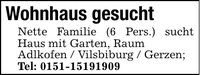 Wohnhaus gesucht Nette Familie (6 Pers.) sucht Haus mit Garten, RaumAdlkofen / Vilsbiburg / Gerzen;Tel: ***