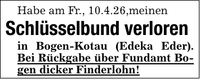 Habe am Fr., 10.4.26,meinenSchlüsselbund verlorenin Bogen-Kotau (Edeka Eder). Bei Rückgabe über Fundamt Bogen dicker Finderlohn!