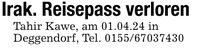 Irak. Reisepass verlorenTahir Kawe, am 01.04.24 inDeggendorf, Tel. ***
