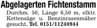 Abgelagerten FichtenstammDurchm. 50, Länge 6,50 m, elktr. Kettensäge u. Benzinrasenmäher gesucht, Tel. ***