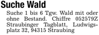 Suche WaldSuche 1 bis 6 Tgw. Wald mit oder ohne Bestand. Chiffre ***Z Straubinger Tagblatt, Ludwigsplatz 32, 94315 Straubing