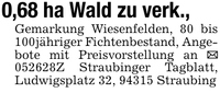 0,68 ha Wald zu verk., Gemarkung Wiesenfelden, 80 bis 100jähriger Fichtenbestand, Angebote mit Preisvorstellung an _ ***Z Straubinger Tagblatt, Ludwigsplatz 32, 94315 Straubing