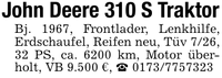 John Deere 310 S TraktorBj. 1967, Frontlader, Lenkhilfe, Erdschaufel, Reifen neu, Tüv 7/26, 32 PS, ca. 6200 km, Motor überholt, VB 9.500 €, _ ***