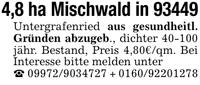 4,8 ha Mischwald in 93449Untergrafenried aus gesundheitl. Gründen abzugeb., dichter 40-100 jähr. Bestand, Preis 4,80€/qm. Bei Interesse bitte melden unter_ *** + ***