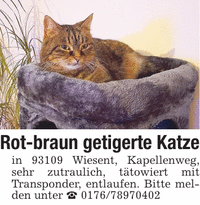 Rot-braun getigerte Katze in 93109 Wiesent, Kapellenweg, sehr zutraulich, tätowiert mit Transponder, entlaufen. Bitte melden unter _ ***