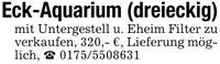 Eck-Aquarium (dreieckig)mit Untergestell u. Eheim Filter zu verkaufen, 320,- €, Lieferung möglich, _ ***
