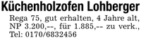 Küchenholzofen LohbergerRega 75, gut erhalten, 4 Jahre alt, NP 3.200,--, für 1.885,-- zu verk., Tel: ***