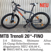 MTB Trenoli 26''-FINO 2.6 Edition, Shimano Altus 24-Gang-Scheibenbremse uvm. Abgabepreis NEU 430,00 €, _ ***, nur Abholung. NEU