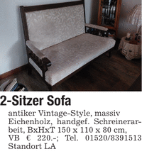 2-Sitzer Sofaantiker Vintage-Style, massivEichenholz, handgef. Schreinerarbeit, BxHxT 150 x 110 x 80 cm,VB € 220.-; Tel. *** Standort LA