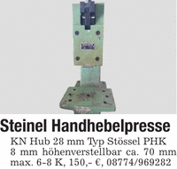 Steinel Handhebelpresse KN Hub 28 mm Typ Stössel PHK 8 mm höhenverstellbar ca. 70 mm max. 6-8 K, 150,- €, ***