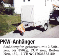 PKW-Anhänger Stoßdempfer, gebremst, mit 2 Stützen, bis 850kg, TÜV neu, Reifen Neu, 430,- € VB _***