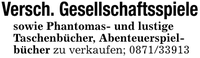Versch. Gesellschaftsspielesowie Phantomas- und lustigeTaschenbücher, Abenteuerspiel-bücher zu verkaufen; ***