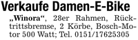 Verkaufe Damen-E-Bike"Winora", 28er Rahmen, Rücktrittsbremse, 2 Körbe, Bosch-Motor 500 Watt; Tel. ***