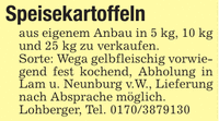 Speisekartoffelnaus eigenem Anbau in 5 kg, 10 kg und 25 kg zu verkaufen.Sorte: Wega gelbfleischig vorwiegend fest kochend, Abholung in Lam u. Neunburg v.W., Lieferung nach Absprache möglich. Lohberger, Tel. ***