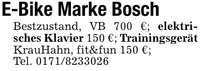E-Bike Marke BoschBestzustand, VB 700 €; elektrisches Klavier 150 €; Trainingsgerät KrauHahn, fit&fun 150 €;Tel. ***