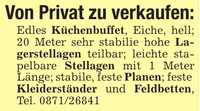 Von Privat zu verkaufen:Edles Küchenbuffet, Eiche, hell; 20 Meter sehr stabilie hohe Lagerstellagen teilbar; leichte stapelbare Stellagen mit 1 Meter Länge; stabile, feste Planen; feste Kleiderständer und Feldbetten, Tel. ***