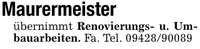 Maurermeister übernimmt Renovierungs- u. Umbauarbeiten. Fa. Tel. ***