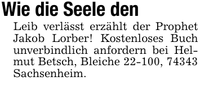 Wie die Seele denLeib verlässt erzählt der Prophet Jakob Lorber! Kostenloses Buch unverbindlich anfordern bei Helmut Betsch, Bleiche 22-100, 74343 Sachsenheim.