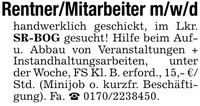 Rentner/Mitarbeiter m/w/dhandwerklich geschickt, im Lkr. SR-BOG gesucht! Hilfe beim Auf- u. Abbau von Veranstaltungen + Instandhaltungsarbeiten, unter der Woche, FS Kl. B. erford., 15,- €/ Std. (Minijob o. kurzfr. Beschäftigung). Fa. _ ***.