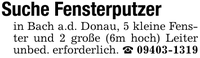 Suche Fensterputzerin Bach a.d. Donau, 5 kleine Fenster und 2 große (6m hoch) Leiter unbed. erforderlich. _ ***
