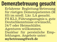Demenzbetreuung gesuchtErfahrene Begleitung/Betreuung für rüstigen Demenzpatienten (M 83) im nördl. Lkr. LA gesucht.FS KL3, Führungszeugnis u. gute Deutschkenntnisse erwünscht,24/7 oder Heimschläfer,Agenturen willkommen.Dankbar für persönliche Empfehlungen. Angebote unter:mybetreuung@web.de