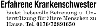 Erfahrene Krankenschwesterbietet liebevolle Betreuung u. Unterstützung für ältere Menschen zu Hause. Tel. ***