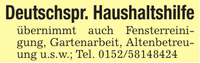 Deutschspr. Haushaltshilfeübernimmt auch Fensterreinigung, Gartenarbeit, Altenbetreuung u.s.w.; Tel. ***