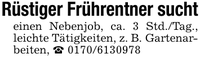 Rüstiger Frührentner suchteinen Nebenjob, ca. 3 Std./Tag., leichte Tätigkeiten, z. B. Gartenarbeiten, _ ***