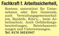 Fachkraft f. Arbeitssicherheit,Rentner, unterstützt Ihr Unternehmen oder Ihre Gemeinde, auch Verwaltungsgemeinschaften, Bauhöfe, Kita's,... beim Arbeitsschutz. Auch Gefährdungsbeurteilungen, Betriebsanweisungen und Unterweisungen.Tel. ***