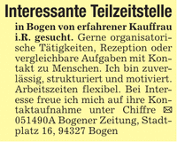 Interessante Teilzeitstellein Bogen von erfahrener Kauffrau i.R. gesucht. Gerne organisatorische Tätigkeiten, Rezeption oder vergleichbare Aufgaben mit Kontakt zu Menschen. Ich bin zuverlässig, strukturiert und motiviert. Arbeitszeiten flexibel. Bei Interesse freue ich mich auf ihre Kontaktaufnahme unter Chiffre _ ***A Bogener Zeitung, Stadtplatz 16, 94327 Bogen