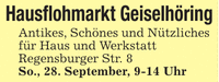 Hausflohmarkt GeiselhöringAntikes, Schönes und Nützliches für Haus und WerkstattRegensburger Str. 8So., 28. September, 9-14 Uhr