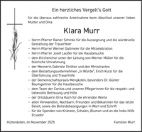 Ein herzliches Vergelt's Gott für die überaus zahlreiche Anteilnahme beim Abschied unserer lieben Mutter und Oma Klara Murr - Herrn Pfarrer Rainer Schinko für die Aussegnung und die würdevolle Gestaltung der Trauerfeier - Herrn Pfarrer Werner Gallmeier für die Mitzelebration - Herrn Pfarrer Josef Laußer für die Hausbesuche - dem Kirchenchor unter der Leitung von Werner Müller für die feierliche Umrahmung - der Mesnerin Gabriele Ströher und den Ministranten - dem Bestattungsunternehmen 'In Würde', Erich Kutzi für die Überführung und Trauerhilfe - der Gemeinschaftspraxis Mengkofen, besonders Dr. Günter Baumgartner für die Hausbesuche - dem Team der Caritas und unseren Pflegerinnen für die respekt- und liebevolle Betreuung und Hilfe - der Ortsbäuerin Erna Koch für die ehrenden Worte - allen Verwandten, Nachbarn, Freunden und Bekannten für das letzte Geleit, sowie die Beileidsbezeigungen in Wort und Schrift - für die Spenden von Kränzen, Schalen, Blumen und an die Indio-Hilfe Ecuador Hüttenkofen, im November 2025Familien Murr