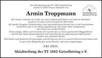Die Skiabteilung des TV 1862 Geiselhöring nimmt in tiefer Trauer Abschied von Armin Troppmann Mit Armin verlieren wir nicht nur einen leidenschaftlichen und aktiven Skifahrer, sondern vor allem einen besonderen Menschen. Mit großer Hingabe, Verlässlichkeit und unermüdlichem Einsatz hat er das Vereinsleben bereichert und in der Abteilungsführung viele Jahre aktiv mitgestaltet. Auf Armin war immer Verlass. Seine ruhige, offene und herzliche Art machte ihn zu einem geschätzten Weggefährten und Freund. Seine Kameradschaft und seine Freude am gemeinsamen Miteinander werden uns unendlich fehlen. Was bleibt, sind dankbare Erinnerungen und die Spuren, die er in unseren Herzen hinterlassen hat. Unser tiefes Mitgefühl gilt seiner Familie und allen Angehörigen. SKI HEIL Skiabteilung des TV 1862 Geiselhöring e.V.