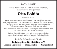 NACHRUF Mit tiefer Betroffenheit haben wir erfahren, dass unser Kolpingbruder Otto Rokita verstorben ist. Otto war seit dem 3. Dezember 1961 Mitglied unserer Kolpingsfamilie und hat über Jahrzehnte als Vorsitzender, Stellvertreter, Bannerträger und in vielen anderen Belangen unsere Gemeinschaft mitgeprägt. Wir bedanken uns für seine Leistungen und werden ihm ein ehrendes Andenken bewahren. Seiner Familie sprechen wir unsere aufrichtige Anteilnahme aus und ein letztes Kolping Treu. In tiefer Verbundenheit für die Kolpingsfamilie Plattling e.V. Cornelia Geisberger Thomas Saller Markus Jakob