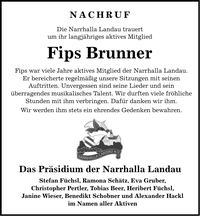 NACHRUFDie Narrhalla Landau trauertum ihr langjähriges aktives Mitglied Fips BrunnerFips war viele Jahre aktives Mitglied der Narrhalla Landau.Er bereicherte regelmäßig unsere Sitzungen mit seinenAuftritten. Unvergessen sind seine Lieder und seinüberragendes musikalisches Talent. Wir durften viele fröhliche Stunden mit ihm verbringen. Dafür danken wir ihm.Wir werden ihm stets ein ehrendes Gedenken bewahren.Das Präsidium der Narrhalla LandauStefan Füchsl, Ramona Schätz, Eva Gruber,Christopher Pertler, Tobias Beer, Heribert Füchsl,Janine Wieser, Benedikt Schobner und Alexander Hacklim Namen aller Aktiven