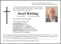 Du hast uns viel bedeutet im Leben, möge Gott dir den ewigen Frieden schenken. In Liebe und Dankbarkeit nehmen wir Abschied von meinem geliebten Ehemann, unserem guten Vater, Opa, Bruder und Onkel Josef Köring * 3. Juni 1936 _ 5. November 2025 Chammünster und Radolfzell In liebevoller Erinnerung: Anna Köring, Ehefrau Christine Köring, Tochter Josef Köring, Sohn mit Sylvia Leonhard, Luis und Letizia, Enkel Elisabeth Baur, Schwester mit Familie Brigitte Seyfried, Schwester mit Familie im Namen aller Verwandten Der Trauergottesdienst mit anschließender Beerdigung findet am Dienstag, 11. 11. 2025, um 14.30 Uhr in der Pfarrkirche Chammünster statt. Die Aussegnung ist am Montag um 18.15 Uhr, anschließend beten wir den Sterberosenkranz. Für Anteilnahme und Gebet ein herzliches Vergelt's Gott.