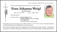 Ein wunderbarer Mensch ist von uns gegangen. In Liebe und Dankbarkeit nehmen wir Abschied von Frau Johanna Weigl geb. Moosmeier geb. 23. Juni 1939 gest. 7. März 2026 Niederlindhart In stiller Trauer: Günter Weigl, Sohn Bernhard Weigl, Sohn mit Petra Steve Büttner im Namen aller Angehörigen Trauerfeier am Donnerstag, den 26. März 2026, um 14.30 Uhr an der Aussegnungshalle am Friedhof Westen; anschließend Urnenbeisetzung. Für bereits erwiesene und noch zugedachte Anteilnahme herzlichen Dank. - Besonderer Dank gilt dem MaMi-Pflegedienst Pfaffenberg und der Tagespflege des BRK Mallersdorf.