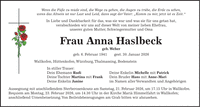 Wenn die Füße zu müde sind, die Wege zu gehen, die Augen zu trübe, die Erde zu sehen, wenn das Altsein ist nur Last und Leid, dann sagt der Vater: 'Komm zu mir, jetzt ist es Zeit.' In Liebe und Dankbarkeit für das, was sie war und was sie für uns getan hat, verabschieden wir uns auf dieser Welt von meiner lieben Ehefrau, unserer guten Mutter, Schwiegermutter und Oma Frau Anna Haslbeck geb. Weber geb. 6. Februar 1941 gest. 30. Januar 2026 Wallkofen, Hüttenkofen, Würzburg, Thalmassing, Bodenstein In stiller Trauer: Dein Ehemann Rudi Deine Enkelin Michelle mit Patrick Deine Tochter Martina mit Frank Dein Bruder Hans mit Anne-Mari Deine Enkelin Janine im Namen aller Verwandten und Angehörigen Aussegnung mit anschließendem Sterberosenkranz am Samstag, 21. Februar 2026, um 17.15 Uhr in Wallkofen. Requiem am Montag, 23. Februar 2026, um 14.30 Uhr in der Kirche Mariä Himmelfahrt in Wallkofen; anschließend Urnenbeisetzung. Von Beileidsbezeugungen am Grab bitten wir abzusehen.