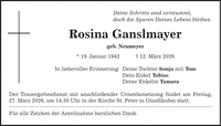 Deine Schritte sind verstummt, doch die Spuren Deines Lebens bleiben. Rosina Ganslmayer geb. Neumeyer * 19. Januar 1942 + 12. März 2026 In liebevoller Erinnerung: Deine Tochter Sonja mit Tom Dein Enkel Tobias Deine Enkelin Tamara Der Trauergottesdienst mit anschließender Urnenbeisetzung findet am Freitag, 27. März 2026, um 14.30 Uhr in der Kirche St. Peter in Gündlkofen statt. Für alle Zeichen der Anteilnahme herzlichen Dank.