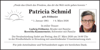'Finde das Glück des Friedens, das dir die Welt nicht geben konnte.' Patricia Schmid geb. Feldmeier * 1. Januar 1961 + 4. März 2026 In stiller Trauer: Ludwig Feldmeier, Bruder mit Familie Roswitha Kammermeier, Schwester mit Familie Die Verabschiedung findet am Freitag, den 27. März 2026 um 14:00 Uhr in der Friedhofshalle in Straubing mit anschließender Urnenbeisetzung statt. Für jede Anteilnahme und Verbundenheit sagen wir herzlichen Dank.