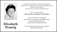 Du hast uns behütet, umsorgt und geliebt. Danke für den Weg, den Du mit uns gegangen bist. Danke für die Hand, mit der Du uns immer gehalten hast. Wir vermissen Dich Deine Kinder und Enkel mit Familien Unser besonderer Dank gilt Frau Bosek vom Hospiz DAHEIM Cham und den Schwestern der Palliativstation Bad Kötzting. Die Urnenbeisetzung fand im engsten Familienkreis statt.Elisabeth Traurig
