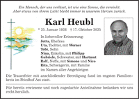 Ein Mensch, der uns verlässt, ist wie eine Sonne, die versinkt. Aber etwas von ihrem Licht bleibt immer in unserem Herzen zurück. Karl Heubl * 25. Januar 1938 + 17. Oktober 2025 In liebevoller Erinnerung: Jutta, Ehefrau Uta, Tochter, mit Werner Tobi, Sohn Nina, Enkelin, mit Philipp Gabriele, Schwester, mit Hartmut Ralf, Neffe, mit Simone und Nico Rita, Schwägerin, mit Familie im Namen aller Angehörigen Die Trauerfeier mit anschließender Beerdigung fand im engsten Familienkreis im Friedhof Ast statt. Für bereits erwiesene und noch zugedachte Anteilnahme bedanken wir uns recht herzlich.