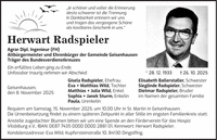 'Je schöner und voller die Erinnerung desto schwerer ist die Trennung. In Dankbarkeit erinnern wir uns und tragen das vergangene Schöne als kostbares Geschenk in uns.' Herwart Radspieler Agrar Dipl. Ingenieur (FH) Altbürgermeister und Ehrenbürger der Gemeinde Geisenhausen Träger des Bundesverdienstkreuzes Ein erfülltes Leben ging zu Ende. Unfassbar traurig nehmen wir Abschied. * 28. 12. 1933 + 26. 10. 2025 Gisela Radspieler, Ehefrau Elisabeth Ballerstaller, Schwester Eva + Matthias Wild, Tochter Sieglinde Radspieler, Schwester Geisenhausen, Matthias + Julia Wild, Enkel Dietmar Radspieler, Bruder den 8. November 2025 Sophia + Janek Sturm, Enkelin im Namen der gesamten Familie Paula, Urenkelin Requiem am Samstag, 15. November 2025, um 10.00 Uhr in St. Martin in Geisenhausen. Die Urnenbeisetzung findet zu einem späteren Zeitpunkt in aller Stille im engsten Familienkreis statt. Anstelle zugedachter Blumen bitten wir um eine Spende an den Förderverein für das Hospiz Vilsbiburg e.V., IBAN: DE***, Kennwort: Herwart Radspieler. Kondolenzadresse: Eva Wild, Kupfersteinstraße 10, 84130 Dingolfing.