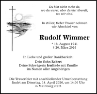 Du bist nicht mehr da, wo du warst, aber du bist überall, wo wir sind. In stiller, tiefer Trauer nehmen wir Abschied von Rudolf Wimmer * 18. August 1941 _ 20. März 2026 In Liebe und großer Dankbarkeit: Dein Sohn Robert Deine Schwägerin Irmlinde mit Familie im Namen aller Angehörigen Die Trauerfeier mit anschließender Urnenbestattung findet am Dienstag, 14. April 2026, um 14.00 Uhr in Mainburg statt.