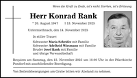 Wenn die Kraft zu Ende, ist's nicht Sterben, ist's Erlösung. Herr Konrad Rank * 20. August 1947 _ 13. November 2025 Untermiethnach, den 14. November 2025 In stiller Trauer: Schwester Maria Schrüfer mit Familie Schwester Adelheid Wiesmann mit Familie Bruder Josef Rank mit Familie und übrige Verwandtschaft Requiem am Samstag, den 15. November 2025 um 10.00 Uhr in der Pfarrkirche Pondorf mit anschließender Beerdigung. Von Beileidsbezeigungen am Grabe bitten wir Abstand zu nehmen.