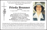 In Liebe und Dankbarkeit nehmen wir Abschied von unserer lieben Mutter, Schwiegermutter, Oma und Tante Frieda Brunner geb. Fertl * 9. April 1938 + 19. März 2026 In liebevoller Erinnerung: Robert Brunner, Sohn, mit Martina Martina Brunner, Tochter, mit Markus Katharina, Simon, Christina, Magdalena und Alexander, Enkel Reinhold Brunner, Schwager, mit Angiola im Namen aller Angehörigen Aussegnung mit anschließendem Sterberosenkranz am Mittwoch, 25. März 2026, um 18 Uhr in Untergolding. Trauergottesdienst mit anschließender Beerdigung am Donnerstag, den 26. März 2026, um 10.30 Uhr in der Kirche St. Dionysius, Untergolding. Für bereits erwiesene und noch zugedachte Anteilnahme bedanken wir uns herzlich.