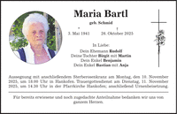 Maria Bartl geb. Schmid * + 3. Mai ***. Oktober 2025 In Liebe: Dein Ehemann Rudolf Deine Tochter Birgit mit Martin Dein Enkel Benjamin Dein Enkel Bastian mit Anja Aussegnung mit anschließendem Sterberosenkranz am Montag, den 10. November 2025, um 18.00 Uhr in Hankofen. Trauergottesdienst am Dienstag, 11. November 2025, um 14.30 Uhr in der Pfarrkirche Hankofen; anschließend Urnenbeisetzung. Für bereits erwiesene und noch zugedachte Anteilnahme bedanken wir uns von ganzem Herzen.