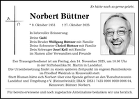 Er hätte noch so gerne gelebt. Norbert Büttner * 9. Oktober 1951 _ 27. Oktober 2025 In liebevoller Erinnerung: Deine Gabi Dein Bruder Wolfgang Büttner mit Familie Deine Schwester Christl Büttner mit Familie Dein Schwager Josef Kell mit Familie im Namen aller Verwandten und Freunde Der Trauergottesdienst ist am Freitag, den 14. November 2025, um 10.00 Uhr in der Stiftsbasilika St. Martin in Landshut. Die Urnenbeisetzung findet zu einem späteren Zeitpunkt im engsten Familienkreis im Friedhof Waldruh in Kronwinkl statt. Statt Blumen hätte sich Norbert über eine Spende gefreut an den Tierschutzverein Landshut und Umgebung e.V. (Heinzelwinkl); IBAN: DE***, Kennwort: Büttner Norbert. Für bereits erwiesene und noch zugedachte Anteilnahme bedanken wir uns herzlich.