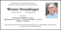 Menschen, die wir lieben, bleiben immer, denn sie hinterlassen Spuren in unseren Herzen. Werner Straubinger * 21. Juni 1947 _ 22. März 2026 In Liebe: Annemarie Straubinger, Ehefrau Walter Presser, Schwager mit Eva und Florian mit Familie Ismaele und Matteo Trauerfeier mit Urnenbeisetzung am Freitag, den 10. April 2026, um 12.00 Uhr an der Urnenwand in Moosburg.