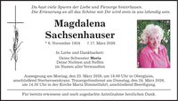 Du hast viele Spuren der Liebe und Fürsorge hinterlassen. Die Erinnerung an all das Schöne mit Dir wird stets in uns lebendig sein. Magdalena Sachsenhauser * 6. November 1934 + 17. März 2026 In Liebe und Dankbarkeit: Deine Schwester Maria Deine Nichten und Neffen im Namen aller Verwandten Aussegnung am Montag, den 23. März 2026, um 18.00 Uhr in Oberglaim, anschließend Sterberosenkranz. Trauergottesdienst am Dienstag, den 24. März 2026, um 14.30 Uhr in der Kirche Mariä Himmelfahrt, anschließend Beerdigung. Für bereits erwiesene und noch zugedachte Anteilnahme herzlichen Dank.